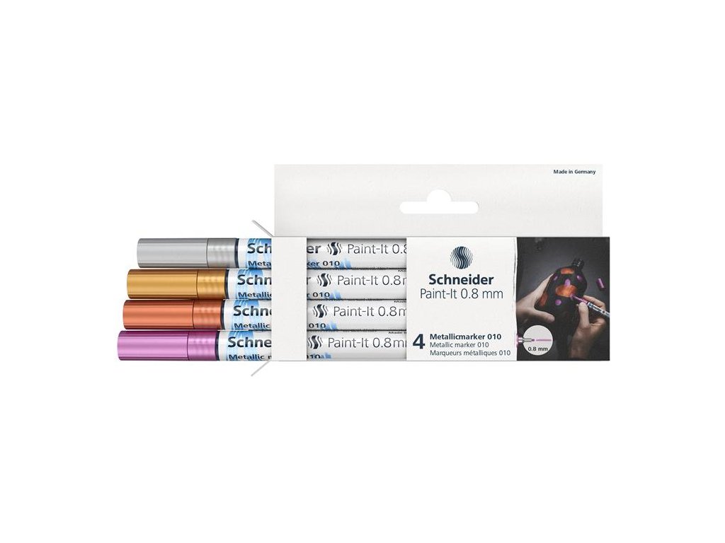 akrylový popisovač s kovovým leskom pre dosiahnutie maximálneho efektu hrúbka písma: 0,8 mm nová pigmentová technológia pre čisté a homogénne farby na rôzne povrchy, najlepší efekt dosiahne na tmavom povrchu rýchloschnúci atrament s ventilom sada obsahuje: 4 rôzne farbyDodatočné parametre