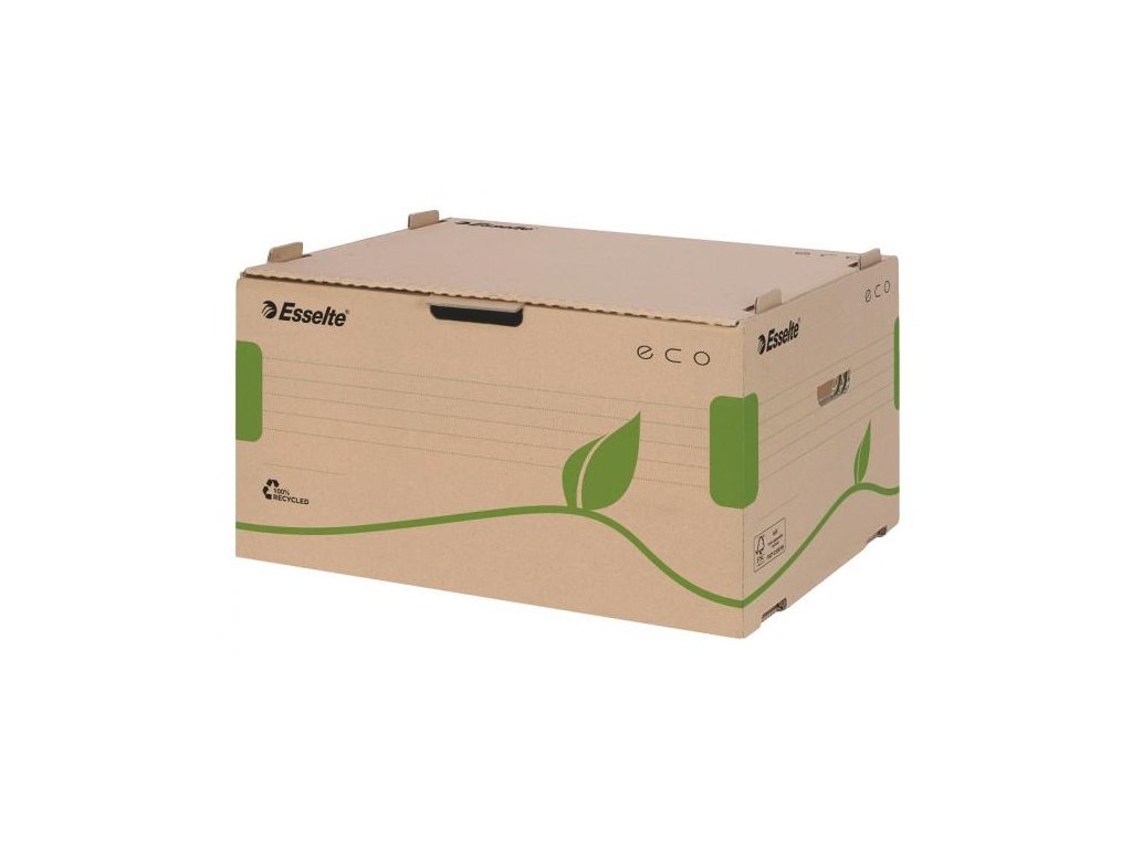 Krabica z archivačného systému Esselte ECO navrhnutá so zeleným prístupom. 100% recyklovateľná s 85% podielom spotrebiteľského odpadu, certifikovaná FSC. Veľkosť optimalizovaná iba na papiere A4 s cieľom minimalizovať odpad pri výrobe.Rozmery (š x v x h): 340 x 259 x 439 mm
