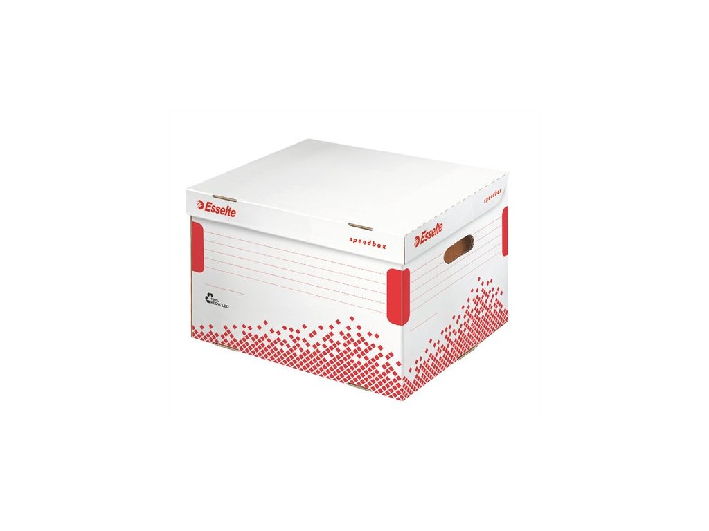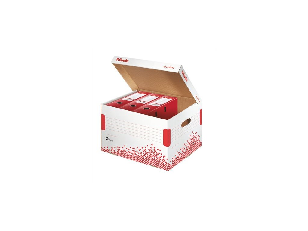 - systém krabíc Speedbox šetrí čas a energiu pri skladaní - zloženie trvá pár sekúnd, jedným pohybom, bez potreby manuálu - archívne kontajnera sú mimoriadne silné a odolné vďaka posilneným bočným stenám a spodku - kontajnery sú stohovateľné - 1 archívny kontajner je vhodný na archiváciu 5 ks ESSELTE šanónov s 75 mm chrbtom - je ideálny: na uchovanie dokumentov väčšieho rozsahu alebo kancelárskych pomôcok; na prenášanie materiálov na prednášky, schôdze, prezentácie - vyrobené zo 100% recyklovanej vlnitej lepenky, 100% recyklovateľné, certifikované FSC - rozmery: 392mm x 301mm x 334 mm Značka: ESSELTE Výrobca: Esselte Kft. Adresa: 1139 Budapest, Lomb u. 37-39. A ép. II. 8., Hungary Web: https://www.accobrands.com/brands/ Email: hungarymarketing@acco.comDodatočné parametre