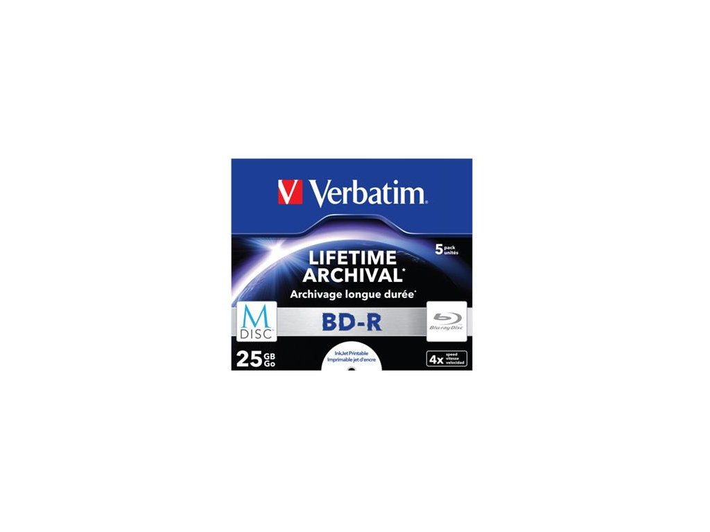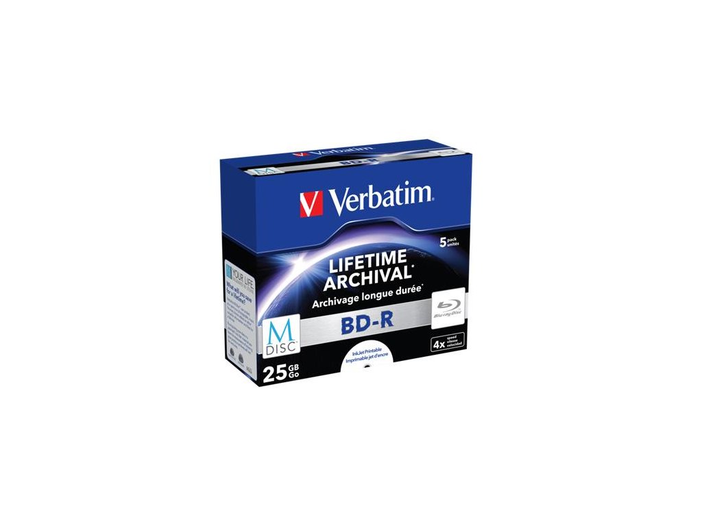 BD-R BluRay disk, archivačný, potlačiteľný, M-DISC, 25GB, 4x, 1 ks, klasický obal, VERBATIM