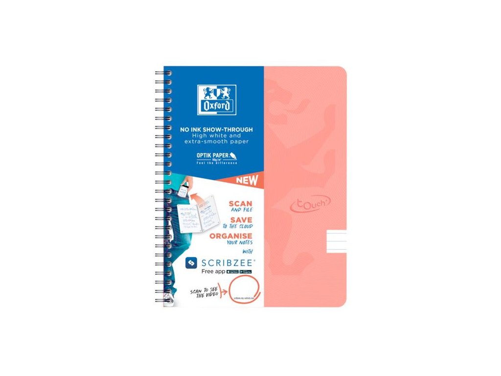 Blok špirálový Oxford Nordic Touch A5+/70 listov linajkový, lososový, dosky na dvojitej čiernej špirále, dosky z tvrdého kartónu so soft touch povrchom, kompatibilný so SCRIBZEE, biely, dokonale hladký papier Optik Paper+, neprepíja, certifikácia EÚ Ecolabel.Dodatočné parametre
