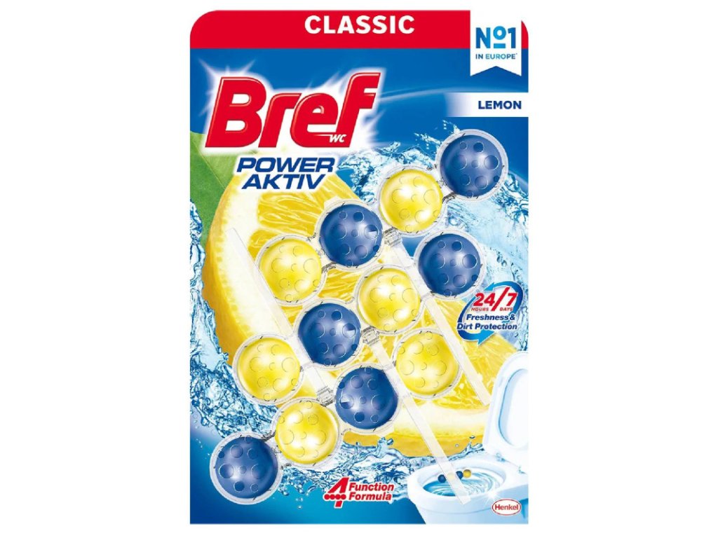 BREF wc blok Power Aktiv Lemon 3 × 50 g Čistiaca pena čistí toaletu pri každom spláchnutí Ochrana pred tvorbou vodného kameňa WC blok Bref Power Aktiv chráni toaletu pred usadzovaním nečistôt Technológia Air Freshener zabezpečí, aby vaša toaleta voňala až do posledného spláchnutia Najjednoduchšia cesta, ako udržať vašu toaletu čistú a sviežu Vďaka praktickému tvaru WC blok BREF dokonale sedí pod okrajom toalety S každým spláchnutím zanecháva sviežu vôňu citróna Vydrží až 240 spláchnutí Cena je za bal./3x50gDodatočné parametre