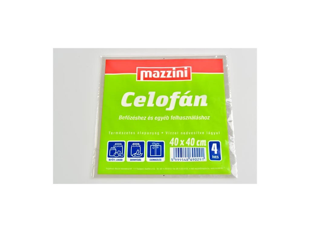 Celofán Mazzini je náš tradičný produkt na utesňovanie zaváracích pohárov, ktorý je vyrobený z priesvitného, ??priesvitného prírodného materiálu na báze celulózy. - čisto priehľadný prírodný materiál na báze celulózy - na rozdiel od zaváracej fólie nemäkne pri zahriatí, ale vďaka kapilárnej trubici pri kontakte s vodou áno - nelámavá krivka celofánu umožňuje rezať a rezať požadovaný alebo požadovaný rozmer - výrobok je hygienický a zdravotne nezávadný - hrúbka: 22 g/m2 - priehľadná Značka: MAZZINI Výrobca: Mazzini International Kft Adresa: 1095 Budapest, Soroksári út 160., Hungary Web: www.mazzini.hu Email: mazzini@mazzini.huDodatočné parametre