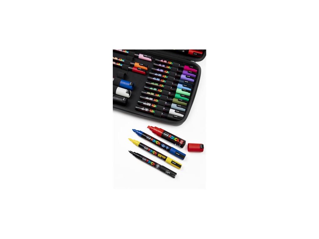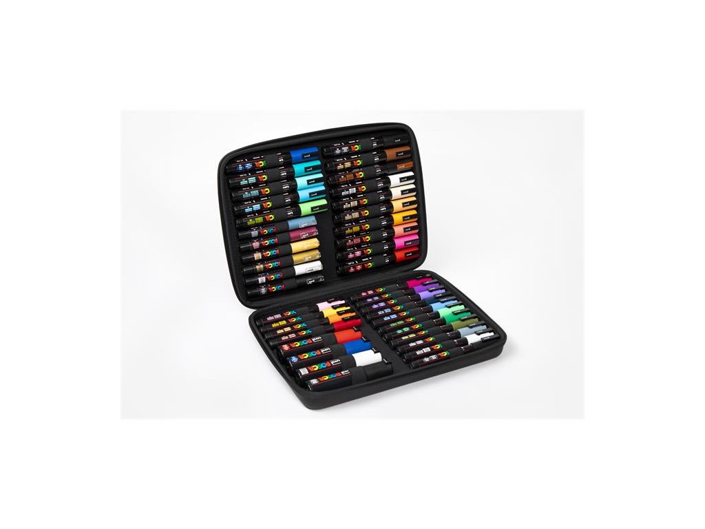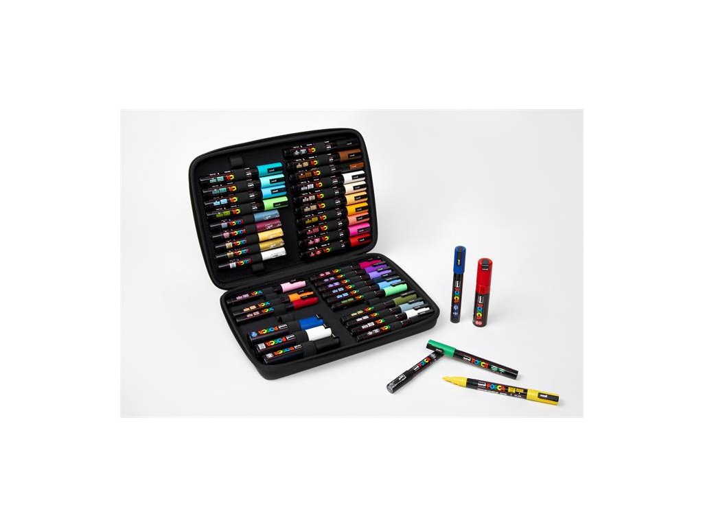40 kusová sada dekoračných popisovačov UNI Posca v praktickom prenosnom kufre. sada obsahuje: po 1 ks popisovače 1,8-2,5 mm, UNI "Posca PC-5M", farby: čierna, hnedá, bronzová, biela, béžová, svetlooranžová, žltá, koralová, ružová, červená, modrá, smaragdovo zelená, morská zelená, svetlomodrá, jablkovo zelená; p 1 ks popisovače 0,9-1,3 mm, UNI "Posca PC-3M", farby: tmavočervenás, oranžová, žltá, svetloružová, čierna, biela, sivá, khaki, zelená, svetlozelená, sky modrý, námornícka modrá, svetlofialová, fialová, fuxiová, po 1 ks popisovače 0,7 mm, UNI "Posca PC-1MR", farby: čierna, biela, zlatá, broskyňová, červená, sivá; po 1 ks 8 mm UNI "Posca PC-8K" so zrezaným hrorom, farby:čierna, biela, modrá, červenáDodatočné parametre