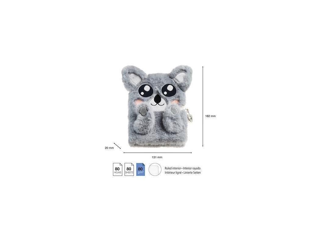 Chlpatý denník s visiacim zámkom "Koala", APLI Back2Fun: 80 listov, linajkový, zaoblené rohy, papier 80 g/m2, predná obálka aj zadná obálka z kartónu potiahnutého chlpatým polyestrom, uzamykateľný, rozmery denníka: 131 x 182 x 20 mm