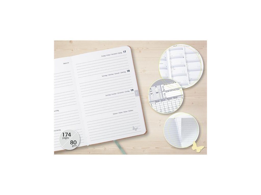 -s označovacou páskou -zapínanie na gumičku -na boku držiak na pero -vnútorná archivačná priehradka a držiak na vizitky -s tabuľkou veľkostí -80 g/m2 papiera -12 listov na poznámky, ktoré sa dajú ľahko vytrhnúť vďaka perforácii -rozmery:135x203x16 mm -jazyk: DE/ENG/FR/NL