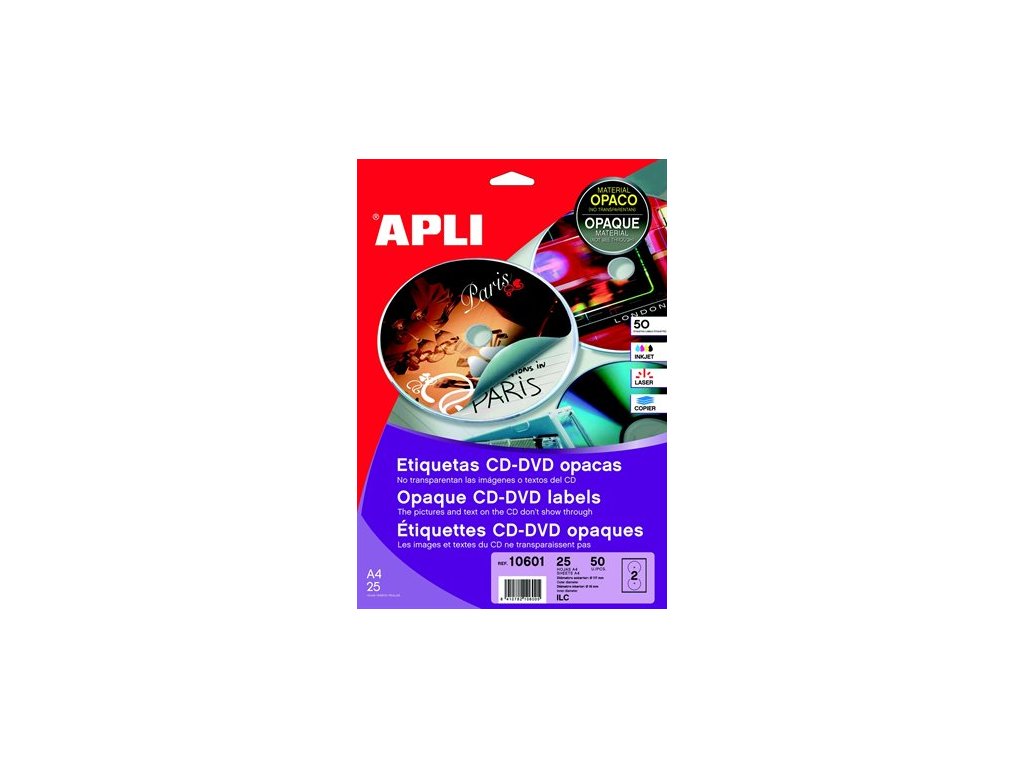 APLI etikety na CD/DVD pre jedinečný vzhľad! - odstrániteľný, matný dizajn - vonkajší priemer: 117 mm - vnútorný priemer: 18 mm - Vytvorte ľahko svoje vlastné návrhy a prispôsobte tak svoje etikety - možno použiť v laserových tlačiarňach a atramentových tlačiarňach - softvér na tlač etikiet "APLI Soft" na stiahnutie zadarmo: www.apli.huDodatočné parametre