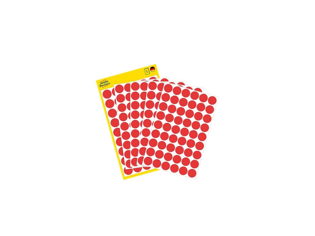 Farebné okrúhle etikety AVERY. -ideálne na: označovanie, systematizáciu, plánovanie, triedenie dokumentov -samolepiace -balenie: 270 ks/bal -farba: červenáZnačka: AVERY ZWECKFORM
