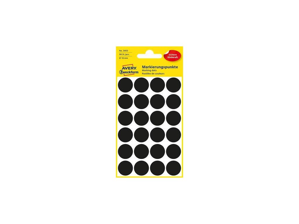 Farebné okrúhle etikety AVERY. -ideálne na: označovanie, systematizáciu, plánovanie, triedenie dokumentov -samolepiace -balenie: 96 ks/bal -farba: čiernaZnačka: AVERY ZWECKFORM