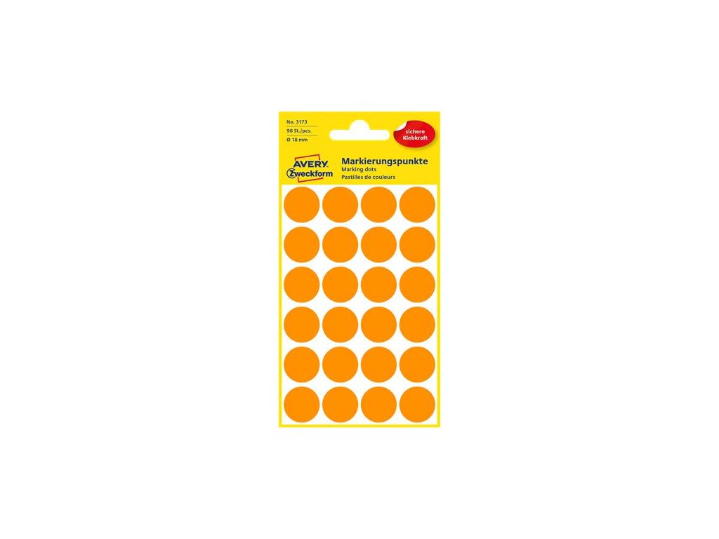 Etikety, okrúhle, priemer: 18 mm, AVERY ZWECKFORM, neónovo oranžové, 96 etikiet/bal