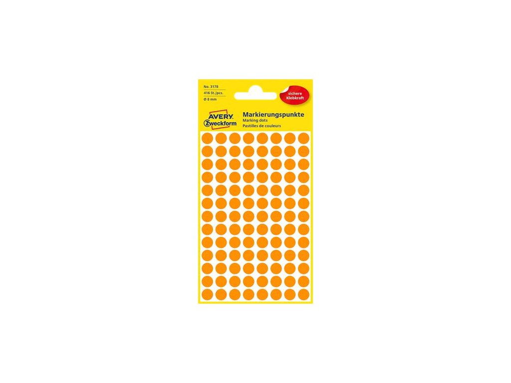 Farebné okrúhle etikety AVERY. -ideálne na: označovanie, systematizáciu, plánovanie, triedenie dokumentov -samolepiace -balenie: 416 ks/bal -farba: neónovo oranžovéZnačka: AVERY ZWECKFORM