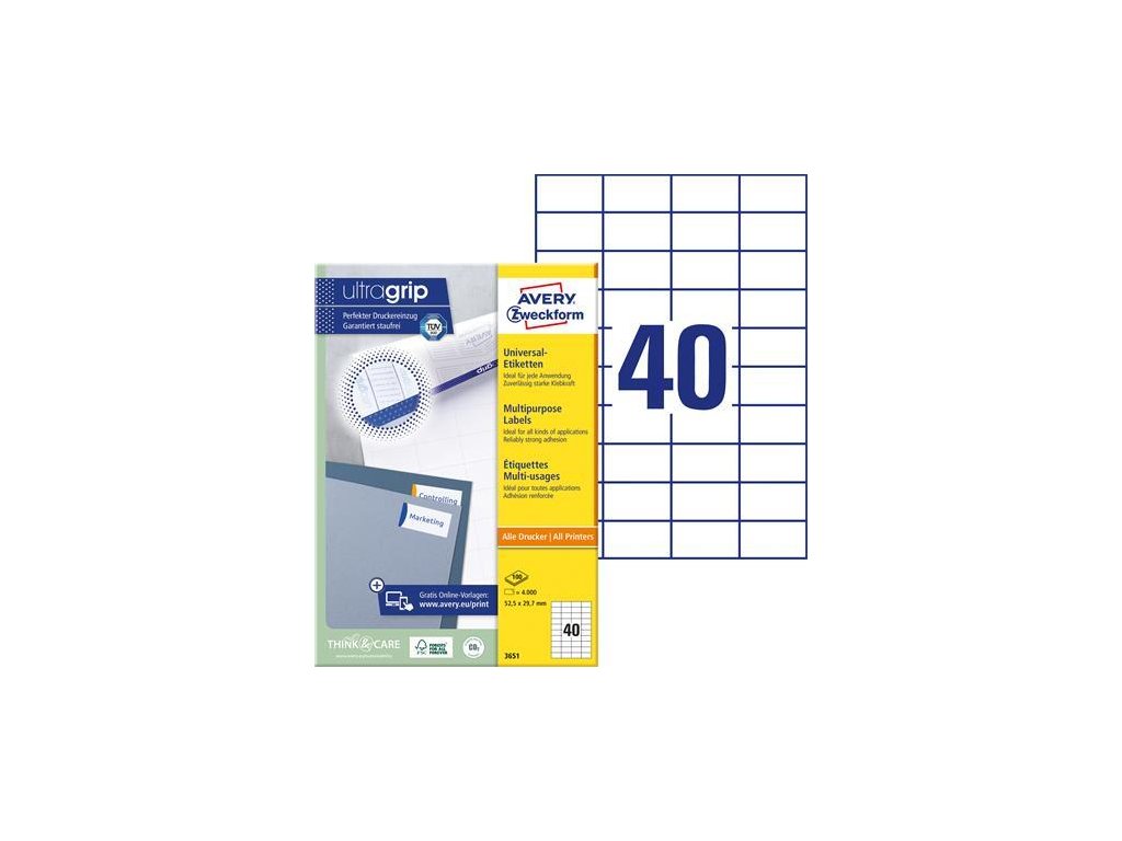 Presné dávkovanie a zaručene bezproblémová tlač vďaka inovatívnej technológii ultragrip®. -ideálne na všeobecné označovanie, napr. na organizáciu, evidenciu a značenie -farba: biela -rozmery: 52,5x29,7 mm -tvar: štvorcový -materiál: ekologický papier s certifikátom FSC®, z udržateľne obhospodarovaných lesov-vhodné pre všetky štandardné laserové a atramentové tlačiarne -bezproblémový chod v laserových tlačiarňach, potvrdený certifikátom TÜV SÜD -bezpečnostný okraj QCT zabraňuje vniknutiu zvyškov lepidla do tlačiarne -extra silná priľnavosť: etikety spoľahlivo držia na papieri, kartóne, skle aj plasteZnačka: AVERY ZWECKFORM