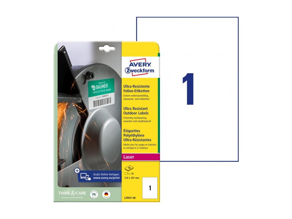 Extrémne odolné etikety, vhodné do tých najnáročnejších podmienok. S ultra silným lepidlom a z materiálu, ktorý je pružný a odolá extrémnym podmienkam, ako teplotám od −40 ° do + 150 °C, špine, mastnote, počasiu, UV žiareniu, morskej vode, mnohým rozpúšťadlám a čistiacim prostriedkom. Sú vhodné pre laserové a farebné laserové tlačiarne a kopírky. Šablóny a softvér pre jednoduchú a rýchlu tlač etikiet k dispozícii zdarma. Farba biela. Etikety na hárku 1 ks. Balenie 10 hárkov.Dodatočné parametre