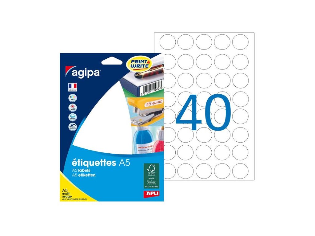 Biele kruhové etikety na formáte A5, na viacúčelovú tlač aj ručný popis.Priemer: 24 mm