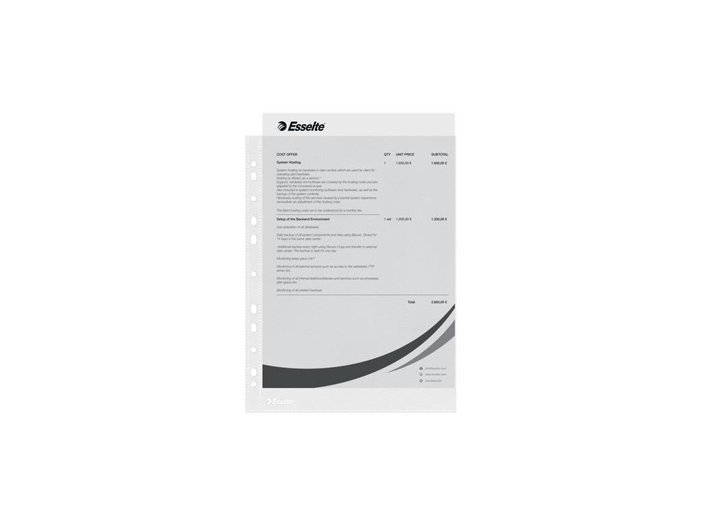 ekonomický obal pre bežné použitie a archiváciu v pákových a krúžkových šanónoch drsný povrch 43 mikr, recyklovateľný PP materiál počet dier: 11 otvor zhora Značka: ESSELTE Výrobca: Esselte Kft. Adresa: 1139 Budapest, Lomb u. 37-39. A ép. II. 8., Hungary Web: https://www.accobrands.com/brands/ Email: hungarymarketing@acco.comDodatočné parametre