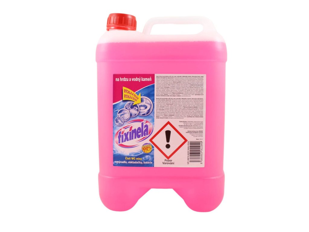 FIXINELA na hrdzu a vodný kameň 5l Kyslý čistiaci prostriedok na silne znečistené povrchy - umývadlá, vane, obkladačky, vodovodné batérie,WC misy. Spoľahlivo odstraňuje usadeniny moču, vodného kameňa, hrdze a iné usadeniny. Vhodné na čistenie v potravinárskych prevádzkach (výrobné zariadenia, nádrže, miestnosti). Upozornenie: Pred použitím produktu si prečítajte návod na použitie. Výrobok používajte iba na materiály odolné voči kyselinám. Prípravok nie je vhodný na čistenie hliníkových povrchov. Nepoužívať spolu s prípravkami obsahujúcimi aktívny chlór. Nepoužívať spolu s alkalickými látkami a zmesami. Nepoužívajte na vane s poškodenou glazúrou. Použitie: Prípravok nastriekajte na navlhčené znečistené miesto a rovnomerne rozotrite špongiou. Nechajte pôsobiť podľa intenzity znečistenia a dôkladne opláchnite vodou. V prípade silného znečistenia postup zopakujte. Obsahuje: kyselina trihydrogenfosforečná; C12-14-alkylalkoholy, etoxylované, sírany, sodné soli. Nebezpečenstvo: Dráždi pokožku. Spôsobuje vážne poškodenie očí. Bezpečnostné upozornenie: Uchovávajte mimo dosahu detí. Po manipulácii si dôkladne umyte ruky mydlom a vodou. Noste ochranné rukavice a ochranné okuliare. Prvá pomoc: PO POŽITÍ: V prípade zdravotných problémov volajte NÁRODNÉ TOXIKOLOGICKÉ INFORMAČNÉ CENTRUM alebo lekára. PRI KONTAKTE S POKOŽKOU: Umyte veľkým množstvom vody a mydla. Ak dôjde k podráždeniu pokožky, vyhľadajte lekársku pomoc. PO OČIACH: Niekoľko minút ich opatrne vyplachujte vodou. Ak nosíte kontaktné šošovky, ak je to možné, vyberte si ich. Pokračujte vo vyplachovaní. Okamžite zavolajte lekára. Pokyny na likvidáciu: Zneškodnite obsah a obal na mieste zberu nebezpečného alebo špeciálneho odpadu. Zloženie: 5-15% kyselina fosforečná, < 5% aniónová povrchovo aktívna látka, farbivo. Cena je za 1ks/5lDodatočné parametre