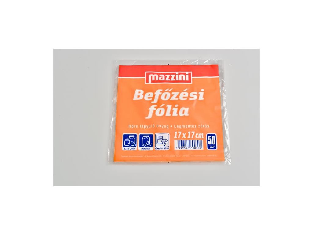 Špeciálna BOPP fólia, ktorá pri zahriatí zmäkne, ale nie pri kontakte s vodou. - jeho tesniaca schopnosť je najlepšia pri teplote okolo 100 °C - jeho predrezaný rozmer je vhodný na zakrytie a uzavretie pohárov na uhorky, zaváraniny a zaváraniny do objemu 5 litrov - výrobok je hygienický a zdravotne nezávadný - hrúbka: 20µ - priehľadná Značka: MAZZINI Výrobca: Mazzini International Kft Adresa: 1095 Budapest, Soroksári út 160., Hungary Web: www.mazzini.hu Email: mazzini@mazzini.huDodatočné parametre
