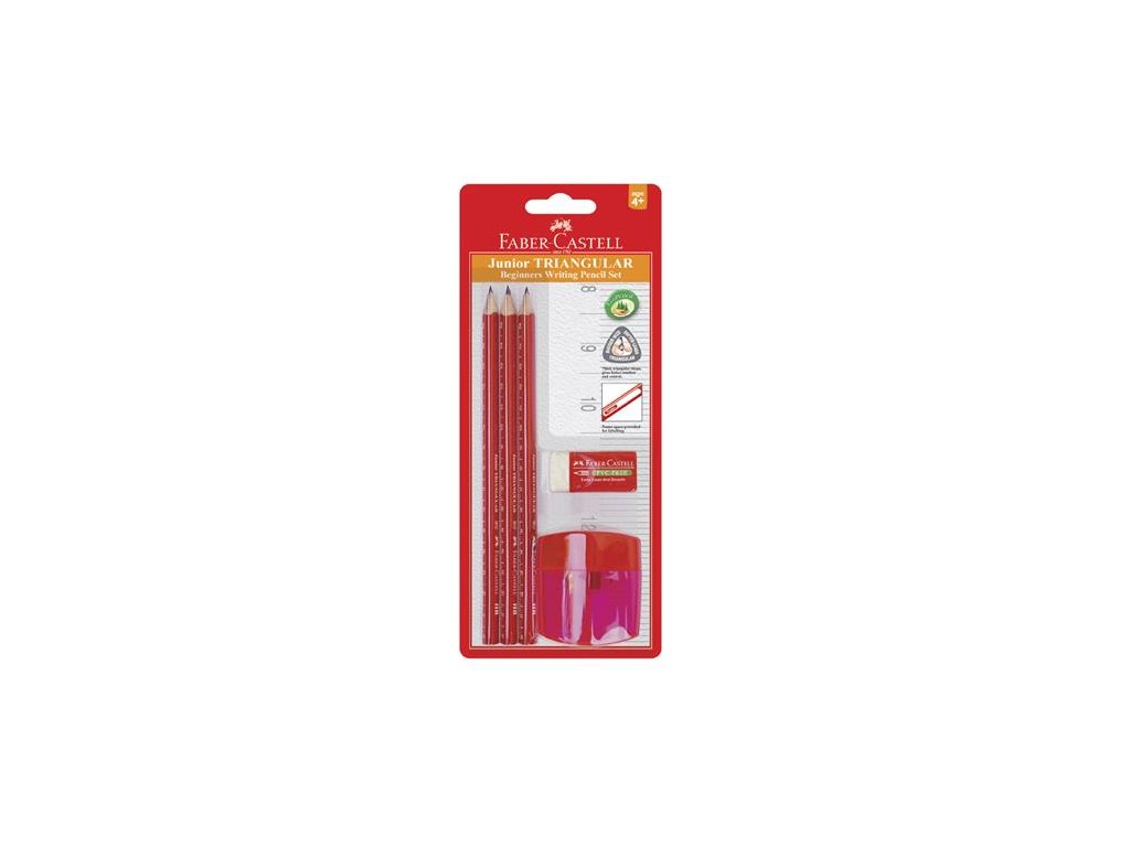 3 ks trojhranných, hrubých HB grafitových ceruziek 1 x guma 1 x dvojité strúhadlo Značka: FABER-CASTELL Výrobca: A.W. Faber-Castell Vertrieb GmbH Adresa: Germany, 90546 Stein Nürnberger str.2. Web: www.faber-castell.com Email: info@faber-castell.deDodatočné parametre