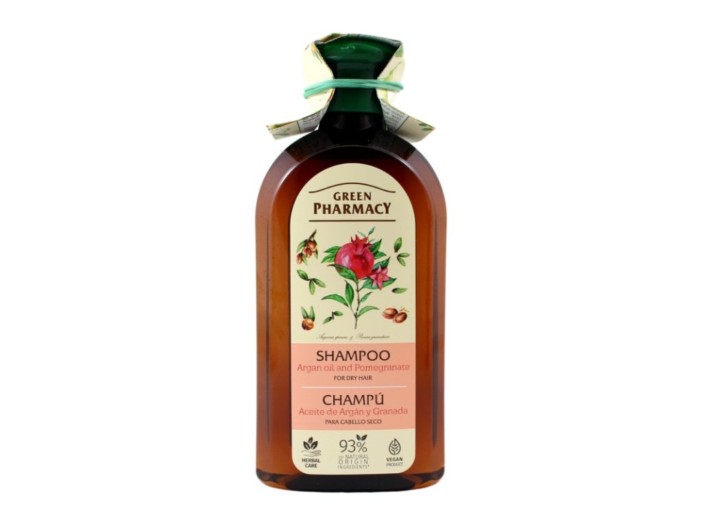 Green Pharmacy šampón na suché vlasy 350 ml – Arganový olej a Granátové jablko Arganový olej, prírodné zlato z Maroka, bohatý na vitamín E, sa používa na regeneráciu poškodených a suchých vlasov s rozštiepenými končekmi. Tento šampón sa vyznačuje tým, že vlasy krásne vyhladzuje, robí ich prírodne lesklými a jemnými. Výťažok z granátového jablka má posilňujúci účinok, regeneruje, upokojuje podráždenie a svrbenie pokožky hlavy a vyživuje vlasy. Obsahuje flavonoidy, ktoré bojujú a chránia pred voľnými radikálmi.Obsahuje prírodné antioxidanty ako vitamín C a vitamín B3, ktoré zlepšujú stav vlasovej pokožky.Ideálny šampón na dosiahnutie ľahkých, lesklých, pružných a dobre hydratovaných vlasov. Vlastnosti: poskytuje potrebnú hydratáciu opravuje tak mechanické, ako aj chemické poškodenie chráni vlasy pred poškodením zlepšuje štruktúru vlasov zaisťuje vlasom oslnivý leskDodatočné parametre