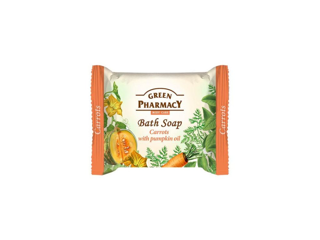 Jedinečné toaletné mydlo Green Pharmacy s prírodnými zložkami efektívne čistí, hydratuje, zvláčňuje pokožku a zlepšuje jej ochranné funkcie. Obohatené o mrkvu s pomarančovým extraktom a tekvicovým olejom. Betakarotén, na ktorý je mrkva bohatá, potláča negatívny vplyv voľných radikálov vznikajúcich pôsobením UV žiarenia, zbavuje pleť škodlivín a podporuje proces jej regenerácie. Tekvicový olej obsahuje spomedzi minerálnych látok zinok, fosfor, selén, magnézium, mangán a ďalších šesť látok. Tiež sa môže pochváliť vysokým zastúpením celého spektra vitamínu B a aj pre krásu prospešného E-čka. Vhodný je aj pre ľudí trpiacich ekzémom, psoriázou a používať ho môžu aj malé deti. Dodáva jej zároveň stratenú elasticitu a zlepšuje jej vzhľad.Dodatočné parametre