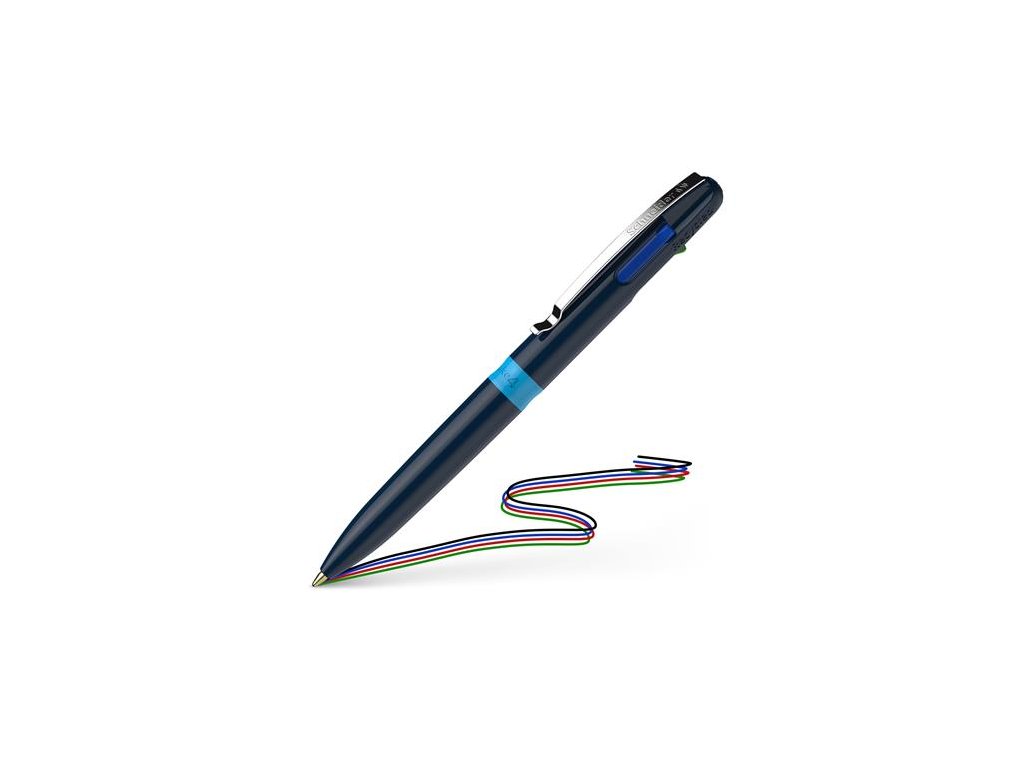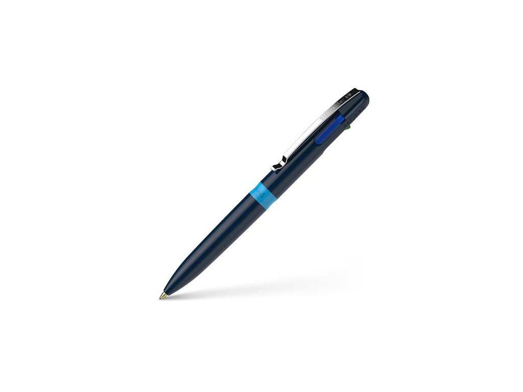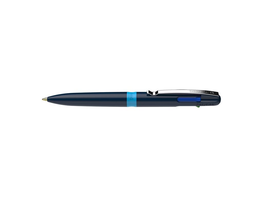 Guľôčkové pero, 0,5 mm, stláčací mechanizmus, 4-farebné, SCHNEIDER "Take 4", tmavomodrá