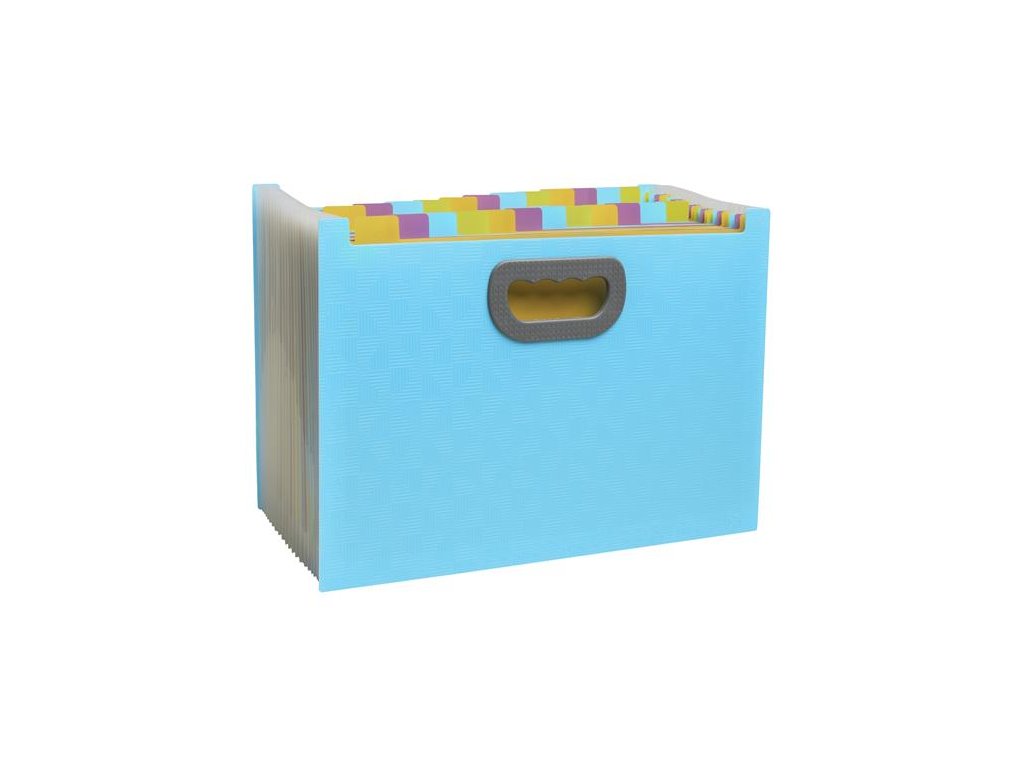 na uchovávanie dokumentov formátu A4 - kapacita: 800 listov (80 g/m2) -materiál: PP s certifikátom Blue Angel - pružný, odolný, z polypropylénového materiálu -vyhotovenie s registrom, s možnosťou popisu na štítkoch - 24 priehradiek - reliefovaný povrch, vo vnútri priehradky rôznych farieb - rozmery: 330 x 235 x 250 mm -s úchytmi na oboch stranáchDodatočné parametre