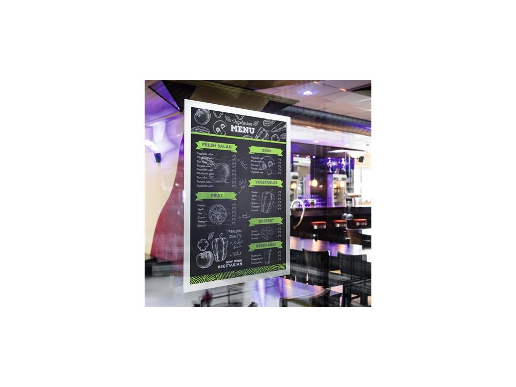 - informačný panel so statickým priľnutím pre použitie na okná, vystavené priamemu slnečnému žiareniu - s ochranou voči UV žiareniu - odoláva teplotám až do 70 °C - v prípade potreby je ľahko premiestniteľný - formát A3 - samolepiaciDodatočné parametre