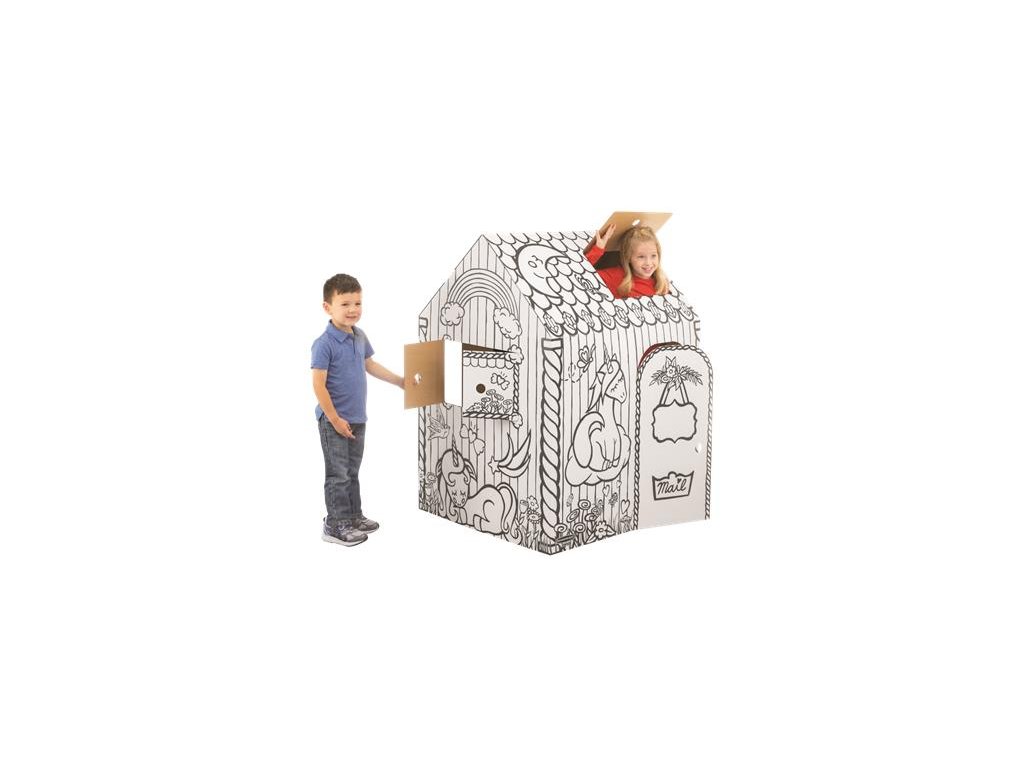 Kreatívny domček pre deti odolný kartón so zaoblenými rohmi možnosť vyfarbenia fixkami, ceruzkami alebo vodovými farbami (nie sú súčasťou balenia) otvárateľné dvere a okná vyhovuje normám CE a UKCA pre deti nad 3 rokov ľahká montáž v 2 krokoch, bez použitia lepidla 2 rôzne vzory, vzor sa nedá vybrať rozmery v zloženom stave: 121,3 x 96,5 x 81,3 cm (výška x šírka x hĺbka)Dodatočné parametre