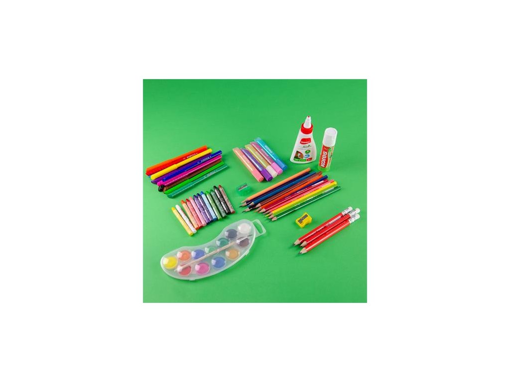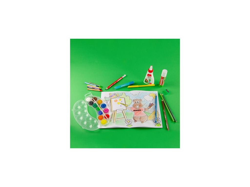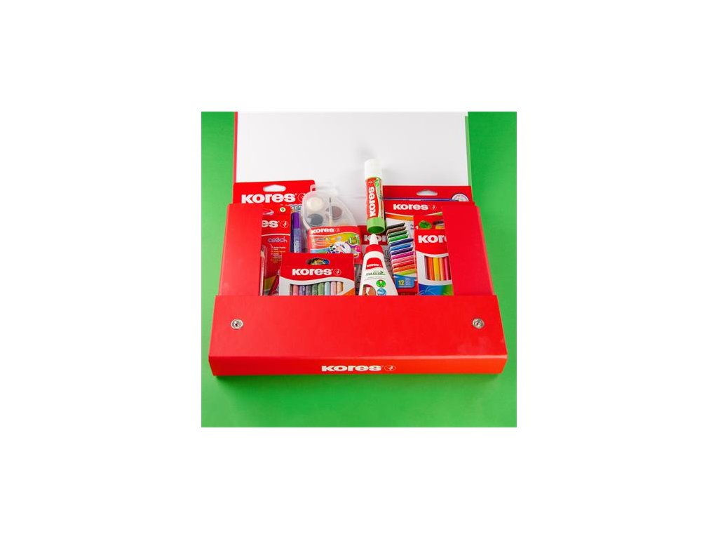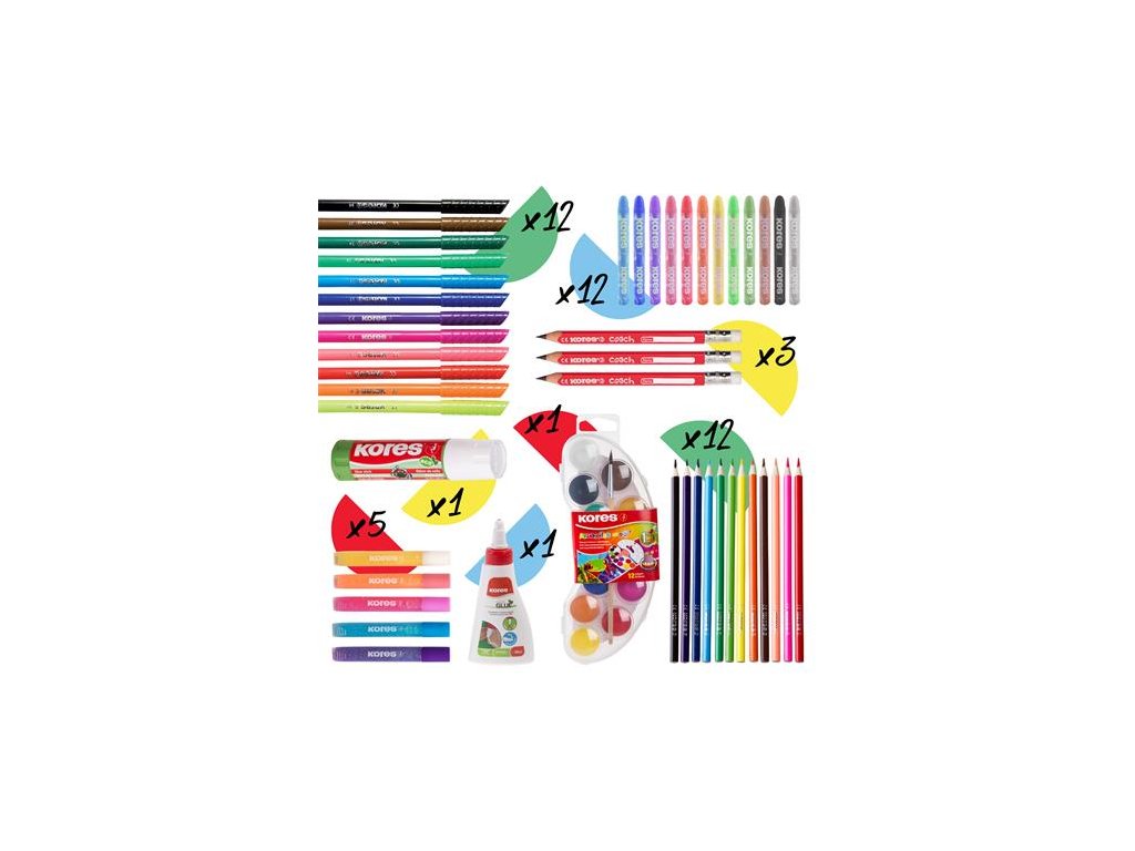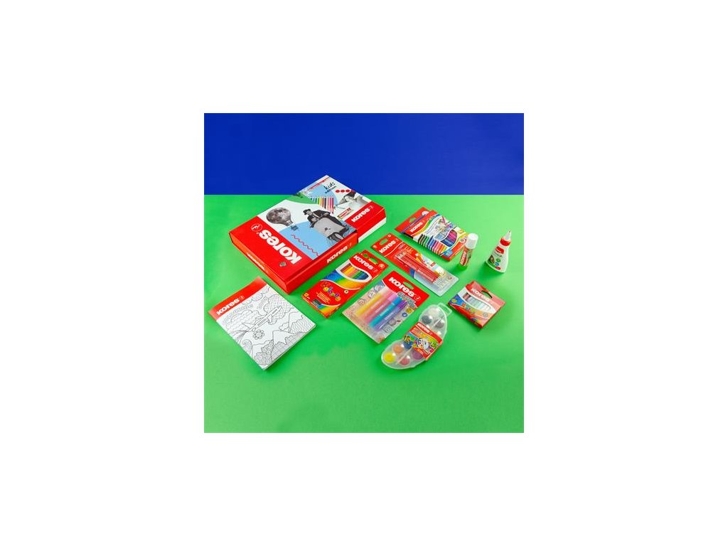 Obsah sady: - Opakovane použiteľný kufrík - Lepiaca tyčinka, 20 g, KORES "Eco Glue Stick" (IK13202) - Hobby lepidlo, 60 g, KORES "White Glue" (IK75816) - Sada fixiek, vyprateľné, KORES "Korellos", 12 rôznych farieb (IK29013) - Sada farebných ceruziek, trojhranné, KORES "Triangular", 12 rôznych farieb (IK100312H) - Grafitová ceruzka s gumou, HB, trojhranné, jumbo, KORES "Coach" (IK92533) - Voskovky, KORES "Krayones", 12 rôznych farieb -Vodové farby, KORES "Akuarellos", 12 rôznych farieb - Trblietavé lepidlo, KORES - Omaľovávanka, KORESDodatočné parametre