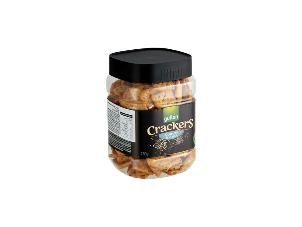 Gullón krekry s quinoou a chia semienkami sú chrumkavé slané sušienky bez vajec a palmového oleja, ideálne na desiatu medzi jedlami. Zloženie: pšeničná múka, slnečnicový olej s vysokým obsahom kyseliny olejovej (17 %), oligofruktóza, cukor, sladový sirup (jačmeň, pšenica), chia semienka (Salvia hispanica) 3,5 %, ľanové semienka, quinoa 3,5 %, soľ 2,5 %, kypriace látky (hydrogénuhličitan sodný a amónny), cesnakový prášok, sušené oregáno, antioxidanty (metabisulfid sodný a extrakt bohatý na tokoferoly). Produkt môže obsahovať stopy mlieka a sóje!Dodatočné parametre