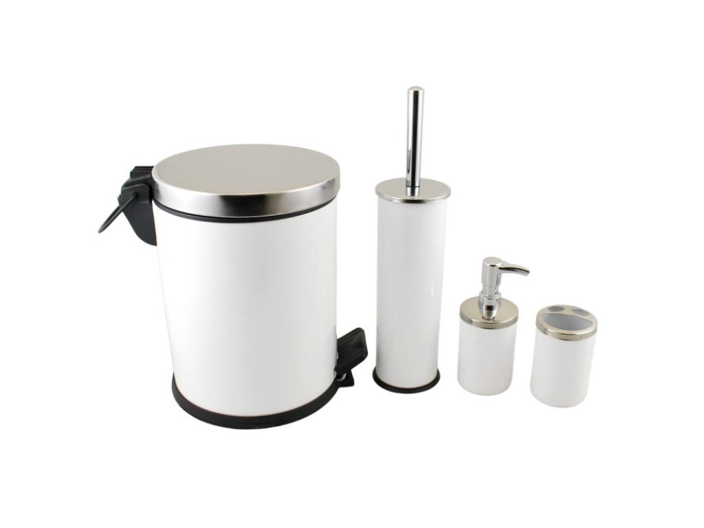 Kúpeľňová sada 4-dielna biela Dodajte svojej kúpeľni nový rozmer elegancie s našou kompletnou kúpeľňovou súpravou, ktorá pozostáva zo štyroch základných kusov. Táto súprava, navrhnutá s ohľadom na funkčnosť a štýl, vám nielen uľahčí každodenné úlohy, ale aj skrášli vašu kúpeľňu. Kúpeľňová sada je z nehrdzavejúcej ocele s povrchovou úpravou. Súprava obsahuje: Držiak na zubné kefky - dokonalé riešenie na hygienické uloženie zubných kefiek a udržiavanie čistoty v miestnosti. Dávkovač mydla - praktický a estetický spôsob uskladnenia tekutého mydla, ktoré sa ľahko a čisto dávkuje. Toaletná kefa - základný predmet na toaletu alebo kúpeľne, ktorý nielenže plní svoj účel, ale aj vyzerá štýlovo a elegantne. Kôš na odpadkový papier 5l - diskrétny, ale funkčný, pre čistú a upratanú kúpeľňu. Každá položka v tejto súprave bola starostlivo navrhnutá tak, aby vyhovovala rôznym štýlom kúpeľne. Vysokokvalitné materiály zaručujú odolnosť a jednoduchú údržbu. Vneste do svojej kúpeľne harmóniu a spojte funkčnosť a estetiku s touto kompletnou súpravou, ktorá uspokojí vaše každodenné potreby a ešte viac vylepší vašu kúpeľňu. Cena je za 4-dielnu sadu.Dodatočné parametre