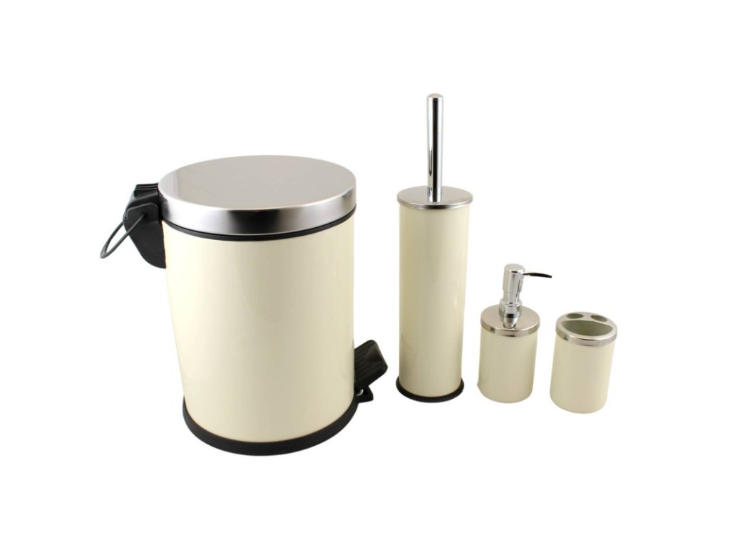 Kúpeľňová sada 4-dielna krémová Dodajte svojej kúpeľni nový rozmer elegancie s našou kompletnou kúpeľňovou súpravou, ktorá pozostáva zo štyroch základných kusov. Táto súprava, navrhnutá s ohľadom na funkčnosť a štýl, vám nielen uľahčí každodenné úlohy, ale aj skrášli vašu kúpeľňu. Kúpeľňová sada je z nehrdzavejúcej ocele s povrchovou úpravou. Súprava obsahuje: Držiak na zubné kefky - dokonalé riešenie na hygienické uloženie zubných kefiek a udržiavanie čistoty v miestnosti. Dávkovač mydla - praktický a estetický spôsob uskladnenia tekutého mydla, ktoré sa ľahko a čisto dávkuje. Toaletná kefa - základný predmet na toaletu alebo kúpeľne, ktorý nielenže plní svoj účel, ale aj vyzerá štýlovo a elegantne. Kôš na odpadkový papier 5l - diskrétny, ale funkčný, pre čistú a upratanú kúpeľňu. Každá položka v tejto súprave bola starostlivo navrhnutá tak, aby vyhovovala rôznym štýlom kúpeľne. Vysokokvalitné materiály zaručujú odolnosť a jednoduchú údržbu. Vneste do svojej kúpeľne harmóniu a spojte funkčnosť a estetiku s touto kompletnou súpravou, ktorá uspokojí vaše každodenné potreby a ešte viac vylepší vašu kúpeľňu. Cena je za 4-dielnu sadu.Dodatočné parametre
