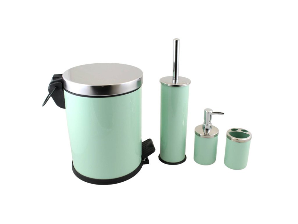 Kúpeľňová sada 4-dielna mentolová Dodajte svojej kúpeľni nový rozmer elegancie s našou kompletnou kúpeľňovou súpravou, ktorá pozostáva zo štyroch základných kusov. Táto súprava, navrhnutá s ohľadom na funkčnosť a štýl, vám nielen uľahčí každodenné úlohy, ale aj skrášli vašu kúpeľňu. Kúpeľňová sada je z nehrdzavejúcej ocele s povrchovou úpravou. Súprava obsahuje: Držiak na zubné kefky - dokonalé riešenie na hygienické uloženie zubných kefiek a udržiavanie čistoty v miestnosti. Dávkovač mydla - praktický a estetický spôsob uskladnenia tekutého mydla, ktoré sa ľahko a čisto dávkuje. Toaletná kefa - základný predmet na toaletu alebo kúpeľne, ktorý nielenže plní svoj účel, ale aj vyzerá štýlovo a elegantne. Kôš na odpadkový papier 5l - diskrétny, ale funkčný, pre čistú a upratanú kúpeľňu. Každá položka v tejto súprave bola starostlivo navrhnutá tak, aby vyhovovala rôznym štýlom kúpeľne. Vysokokvalitné materiály zaručujú odolnosť a jednoduchú údržbu. Vneste do svojej kúpeľne harmóniu a spojte funkčnosť a estetiku s touto kompletnou súpravou, ktorá uspokojí vaše každodenné potreby a ešte viac vylepší vašu kúpeľňu. Cena je za 4-dielnu sadu.Dodatočné parametre