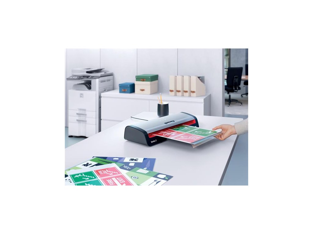 - laminuje 1 A4 stránku za 36 sekúnd (s laminovacou fóliou 75 mikrónov)