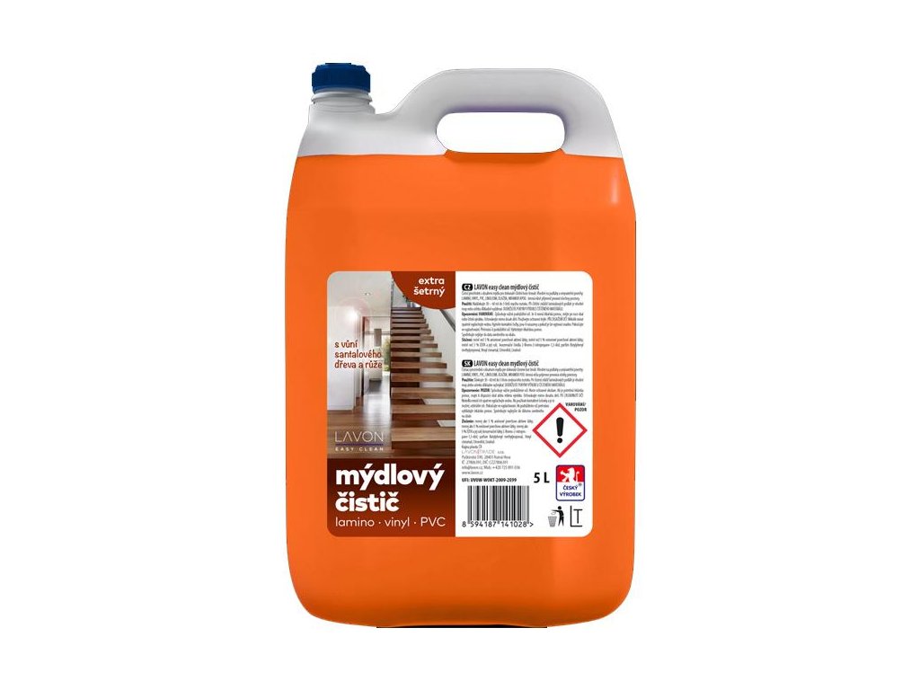 LAVON mydlový čistič  je účinný prostriedok s obsahom mydla na dokonalé čistenie bez šmúh. Je vhodný na podlahy a umývateľné povrchy: lamino, vinyl, PVC, linoleum, dlažba, mramor...a pod. Jemná vôňa santalového dreva a ruže príjemne prevonia všetky priestory.