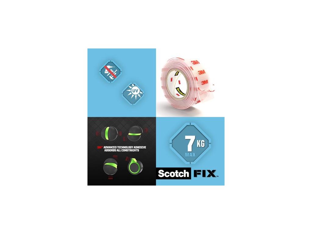 Či už pripevňujete akrylovú kozmetickú nádobu alebo priehľadný rám obrazu, použite obojstrannú priehľadnú lepiacu pásku Scotch-Fix™. - ideálne na upevnenie skla, dlaždíc a umeleckých diel - ideálne riešenie pre predmety, ktoré vyžadujú neviditeľné riešenie upevnenia -ponúka pevné viazanie - nosnosť 7 kg -balenie bez plastov pre trvalú udržateľnosť - obalový materiál je vyrobený z 90% recyklovaného materiálu - vnútro roliek je zo 100% recyklovaného materiáluDodatočné parametre