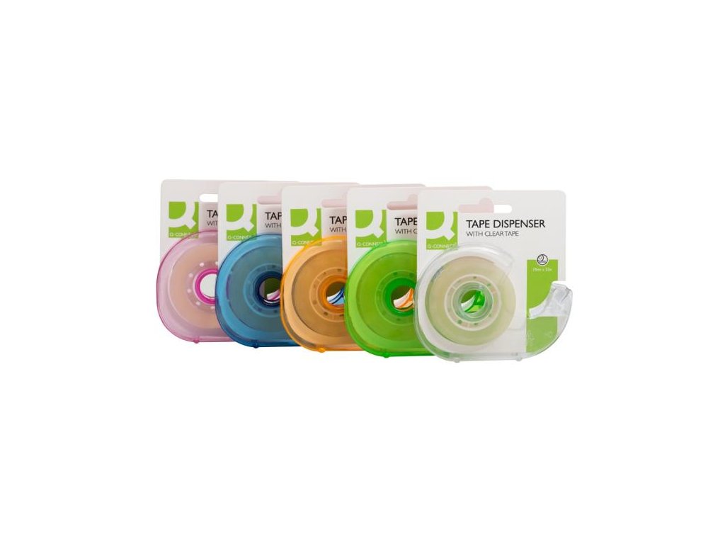 Priehľadná lepiaca páska Q-CONNECT rozmerov 19 mm × 33 m s dispenzorom. Dodávaná v mixe farieb bez možnosti výberu.Dodatočné parametre