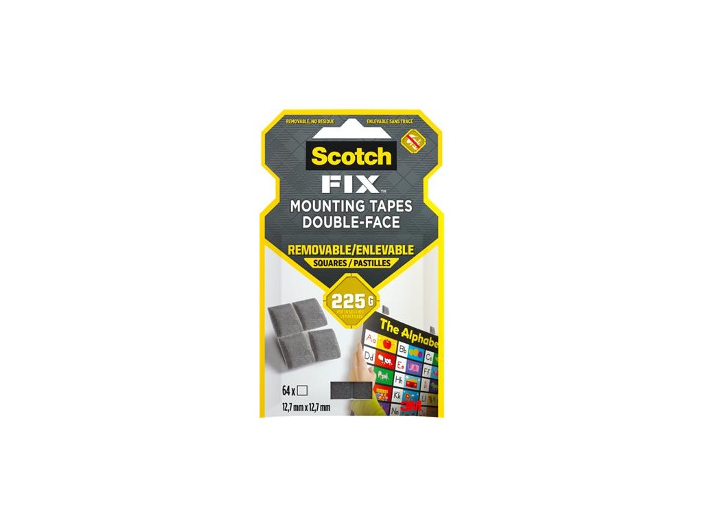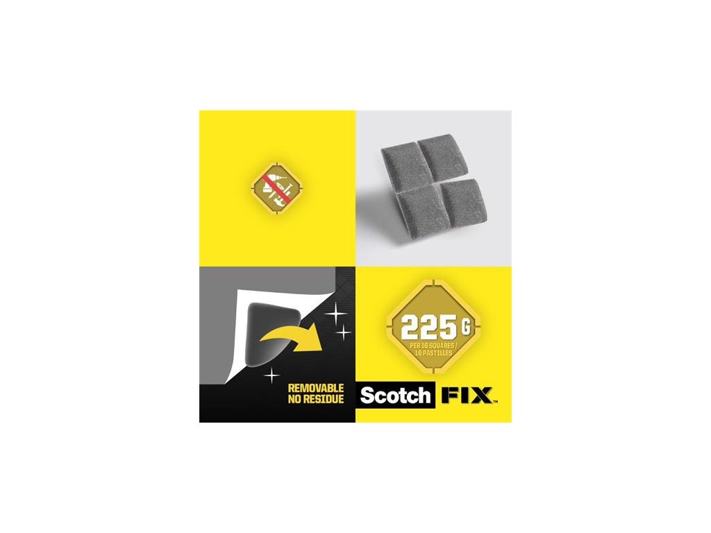Odnímateľné lepiace štvorčeky Scotch-Fix™ sú vynikajúce na lepenie plagátov, plagátov, kalendárov, firemných vyhlásení na sklo, steny a nábytok. - možno použiť na kovové, sklenené, zrkadlové, drevené a plastové povrchy - nosnosť jedného štvorca je 225g -odnímateľné, takže ideálne napr. na dočasné nahrávanie fotografií -rozmer: 1,27 × 1,27 cm - balenie obsahuje 64 štvorčekov -balenie bez plastov pre trvalú udržateľnosť - obalový materiál je vyrobený z 90% recyklovaného materiáluDodatočné parametre