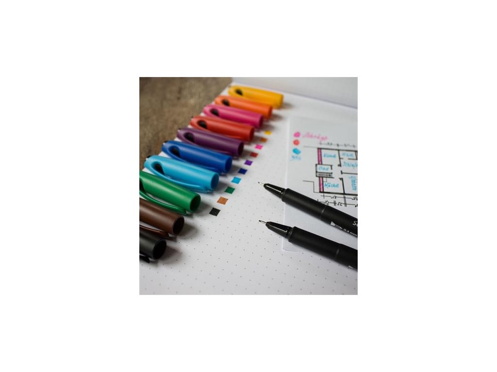 tenké a presné písmo nehrdzavejúci hrot zabezpečuje súvislé písmo atrament na vodnej báze čierne plastové telo farba náplne sa zhoduje s farbou konca pera hrúbka písma: 0,4 mmDodatočné parametre