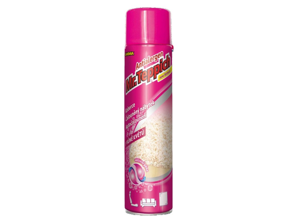 Mr. TEPPICH ANTIALERGEN na čalúnenie „SUCHÁ PENA“ – vôňa kvetu 600ml Mr. Teppich Antialergén- suchá pena je účinný prostriedok na ručné čistenie a starostlivosť o koberce, čalúnený nábytok, autopoťahy a detské autosedačky, ale aj na bezpečnostné pásy a batožinový priestor vo vozidle. Vďaka antialergénnym zložkám dokonale odstraňuje prachové alergény, uľahčuje upratovanie zvieracích chlpov, zabraňuje množeniu baktérií a roztočov, čo je dôležité pre zdravie celej vašej rodiny. Chráni farby, zosilňuje kobercové vlákna. Likviduje nepríjemné pachy a zanecháva príjemnú vôňu kvetov. Prípravok obsahuje polymér, ktorý koberec chráni proti opätovnému znečisteniu. Vlastnosti: na koberce, čalúnenie, autopoťahy a detské sedačky likviduje prachové alergény príjemná kvetinová vôňa Použitie: Dôkladne vysajte čistený povrch. Prípravok riadne pretrepte. Nastriekajte penu na znečistené miesto. Penu dôkladne votrite špongiou alebo kefou do povrchu. Nechajte schnúť (podľa materiálu a rozsahu plochy 20 minút až 2 hodiny). Na záver opäť dôkladne vysajte. Cena je za bal./600mlDodatočné parametre