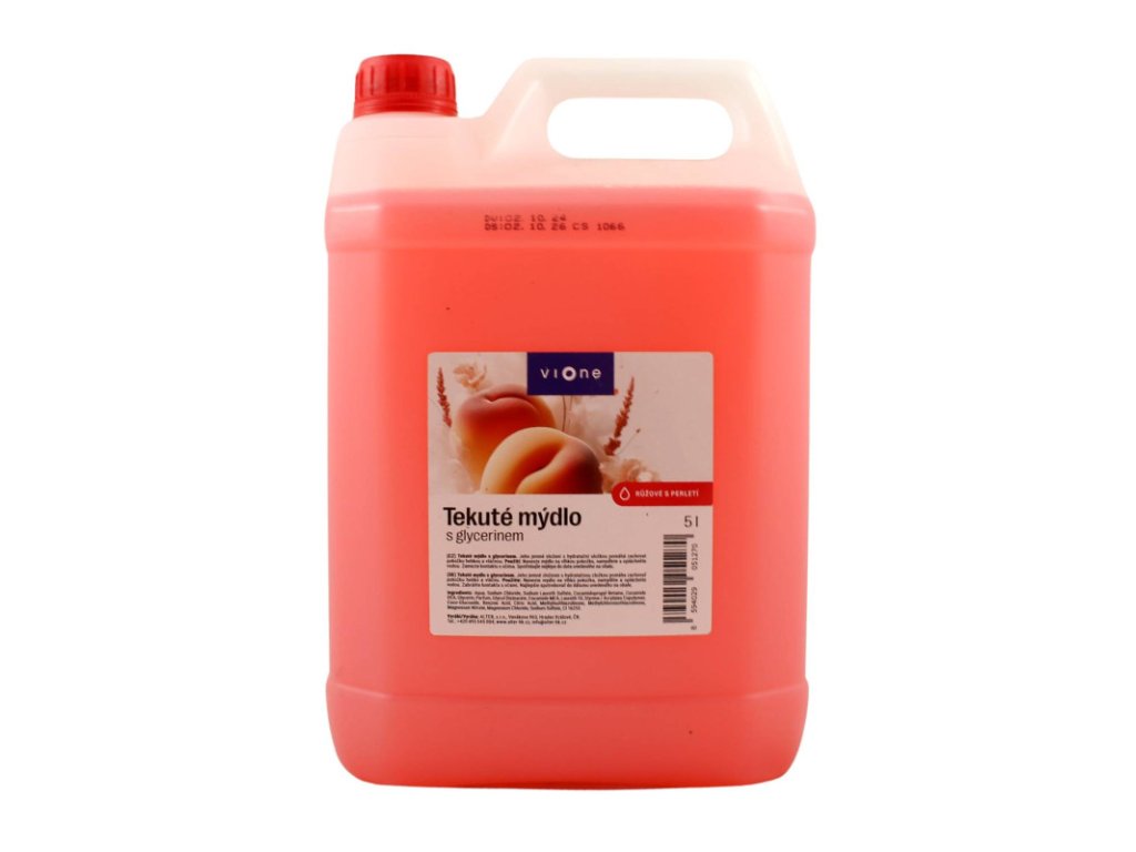 Mydlo perleťové broskyňa 5L s glycerínom, látkou priaznivo pôsobiacou a ošetrujúcou pokožku pred vysušením.