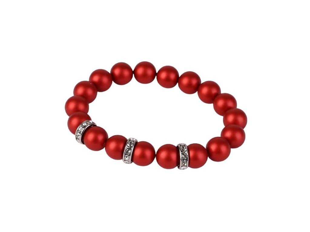 Originálny náramok vyrobený zo Swarovski® perál, zdobený bielymi Swarovski® rondellovými krištálmi. Perly majú červený odtieň. Ide o elegantnú farbu, vhodnú aj k slávnostnému oblečeniu. Náramok sa ľahko nasadzuje aj skladá, keďže je navlečený na elastickej šnúrke. Veľkosť M, približne 18,5 cm, čo je štandardná dámska veľkosť. Balenie obsahuje navliekaciu šnúrku a jednu náhradnú perlu. Balené v darčekovej krabičke.Dodatočné parametre