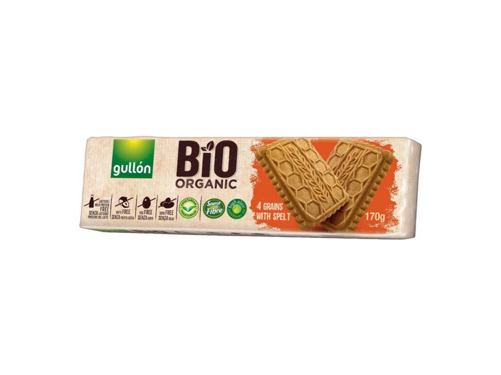 Gullón 4-zrnný keks je nielen chutný, ale neobsahuje ani stopy mlieka, vajec či sóje. Je bohatý na vlákninu, a deti ho radi konzumujú. Nastrúhaný môže byť použitý podobne ako Fosfovit keks pri zavádzaní lepku u malých detí. Zloženie: obilniny 64 % (pšeničná múka*, ovsené vločky*, celozrnná pšeničná múka*, celozrnná ražná múka*, múka zo špaldovej pšenice* 3 %), cukor*, slnečnicový olej (s vysokým obsahom kyseliny olejovej) 15 %, inulín, kypriace látky (hydrogénuhličitan sodný, hydrogénuhličitan amónny), soľ, prírodná aróma, antioxidant (extrakt bohatý na tokoferoly). Bohatý na vlákninu. Bez laktózy, bez mliečnych bielkovín. Neobsahuje orechy ani vajcia. Bez sóje.Dodatočné parametre