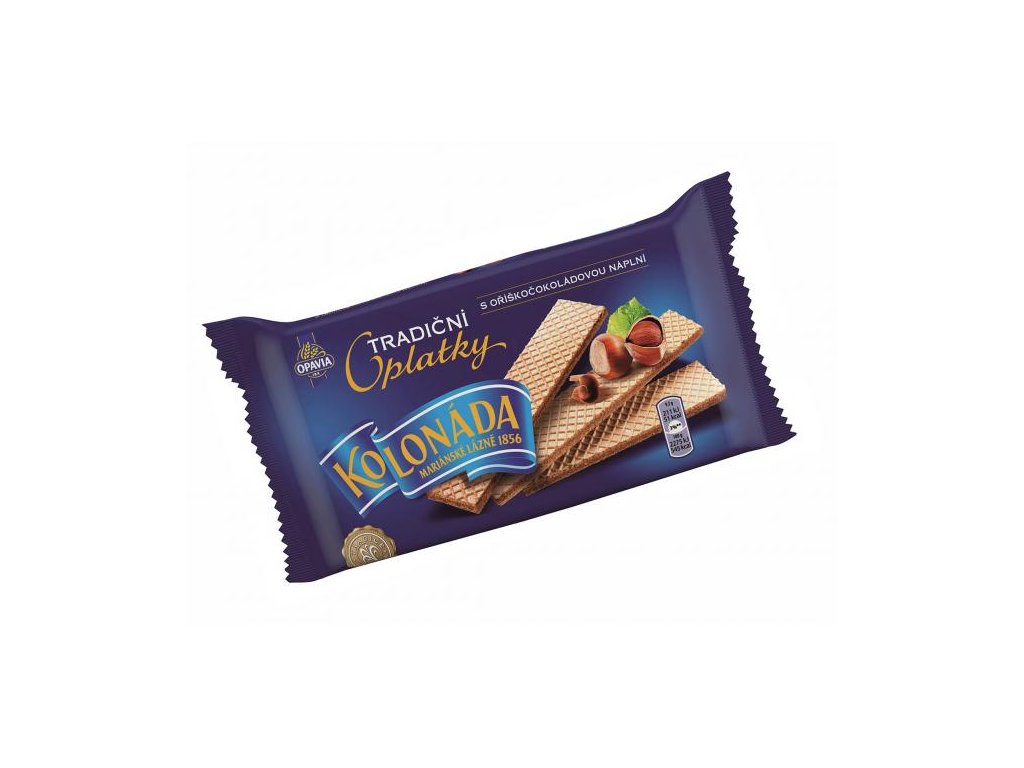 Trandičné krehké oblátky Kolonáda plnené tabuľkou orieškovej čokolády. Hmotnosť 140 g.