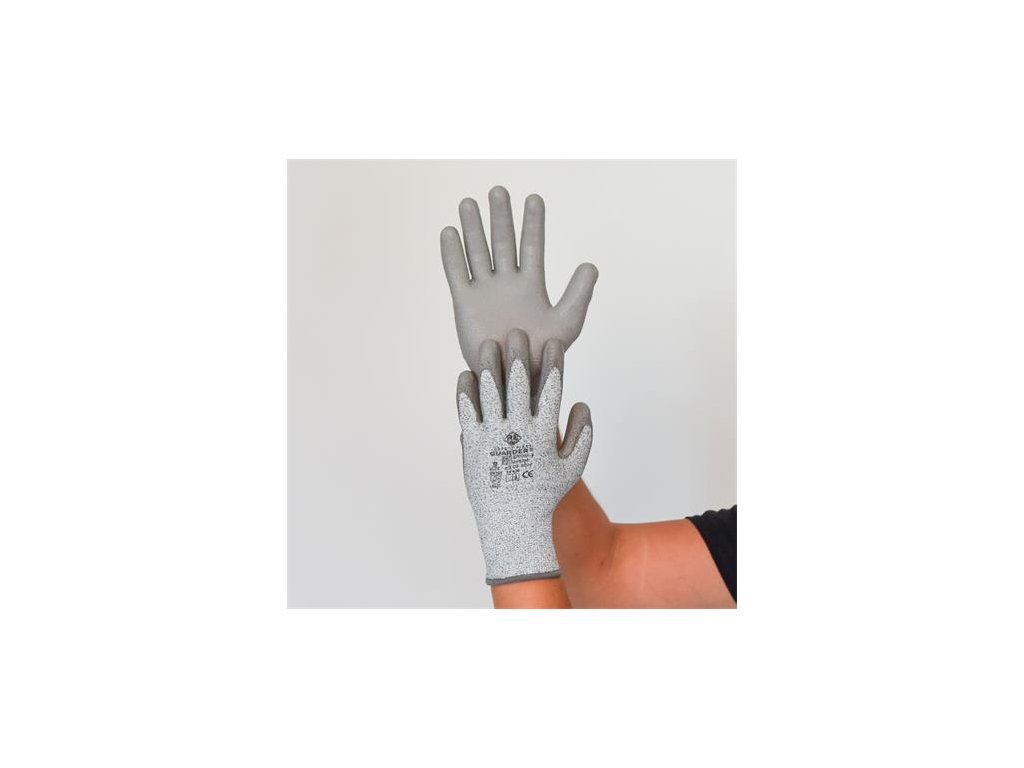 Päťprstové, sivé, proti porezaniu odolné rukavice, máčané v polyuretáne po celej dlani. -materiál: kruhovo pletený čierno-biely úplet z 13g HPPE + nylon + spandex + sklenené vlákno-s polyestrovou, pogumovanou manžetou -na dlani sivý polyuretánový záter -farba: sivá -veľkosť: 11/XXL -balené po pároch v jednotkovom balení -balenie: 1 pár/bal, 240 párov/karton -norma: EN ISO 21420:2020; EN 388:2016 4X43CVýrobca/distribútor: Re-Guard Kft.