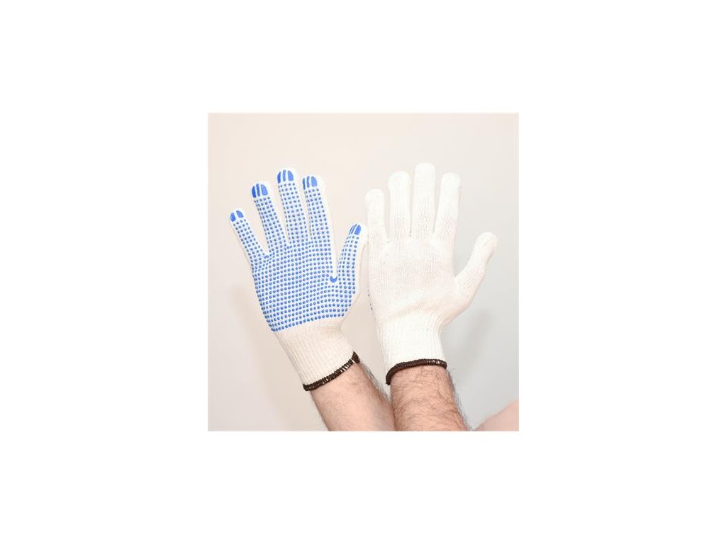Päťprstové, prírodne biele rukavice z polyesterovo-bavlnenej zmesi s PVC bodkovaním na jednej strane. -materiál: 65 % bavlna, 35 % polyesterové vlákno -elastický (pogumovaný) manžetový lem, obšité polyesterovou niťou -veľkosť: 10/XL -balenie: 12 párov/bal, 300 párov/kartón -EU morma: EN 21420:2020; 2016/425 1. CategoryVýrobca/distribútor: Re-Guard Kft.