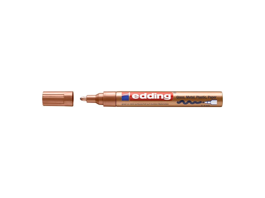 vhodný takmer na všetky povrchy (sklo, kov, porcelán, plast) kuželový hrot kovové telo vode a svetlu odolný, nezotierateľný rýchloschnúci atrament vhodné aj na zašpinené povrchy rovnomerné dávkovanie atramentu farba uzáveru sa zhoduje s farbou náplne hrúbka písma: 2–4 mm Značka: EDDING Výrobca: EDDING INTERNATIONAL GMBH Adresa: Bookkoppel 7, 22926 Ahrensburg, Germany Web: www.edding.com Email: info@edding.comDodatočné parametre