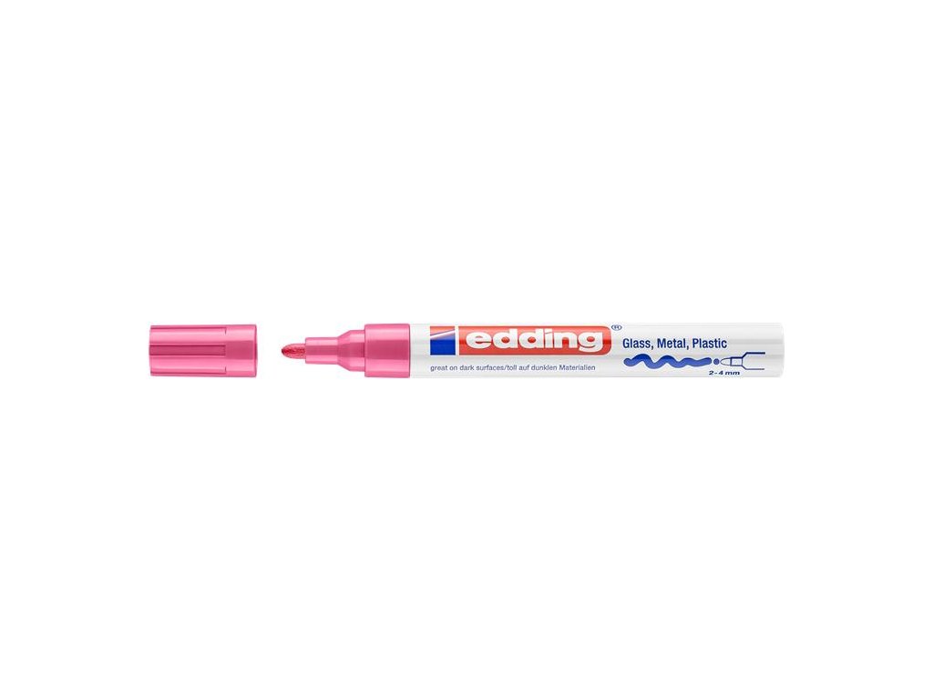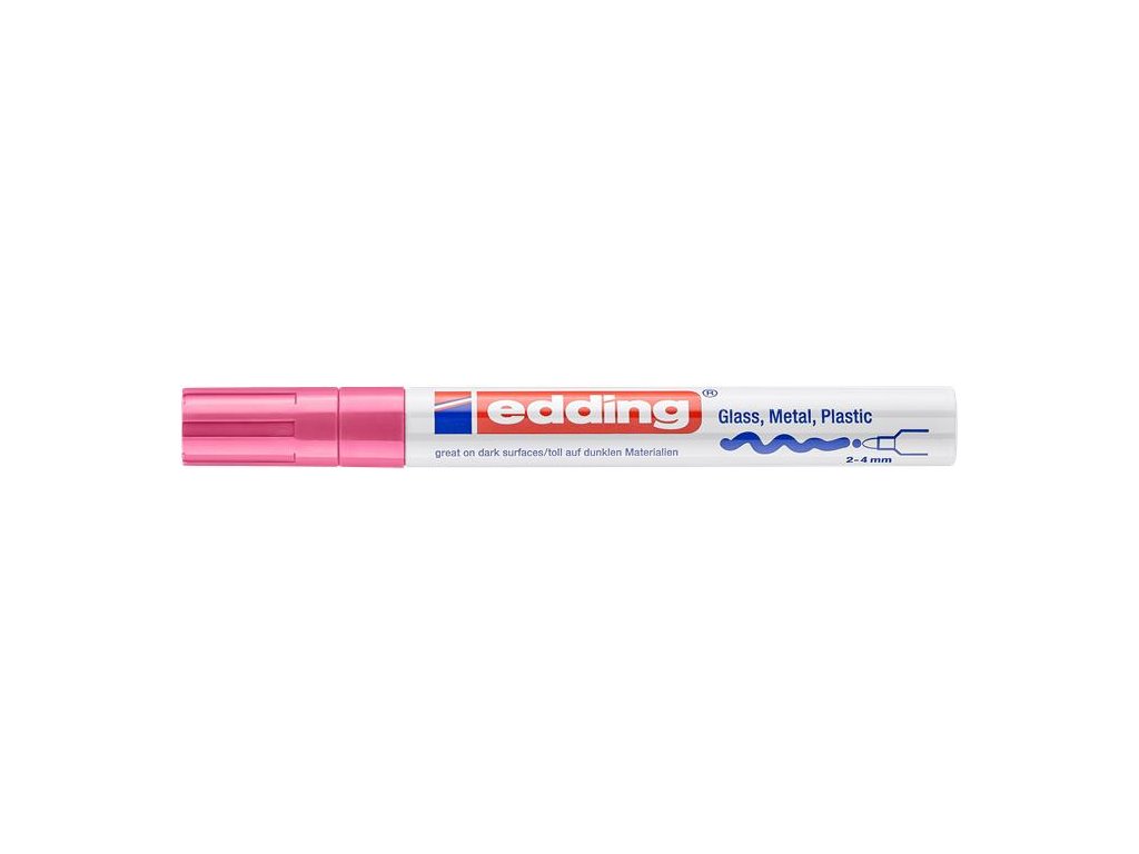 vhodný takmer na všetky povrchy (sklo, kov, porcelán, plast) kuželový hrot kovové telo vode a svetlu odolný, nezotierateľný rýchloschnúci atrament vhodné aj na zašpinené povrchy rovnomerné dávkovanie atramentu farba uzáveru sa zhoduje s farbou náplne hrúbka písma: 2–4 mm Značka: EDDING Výrobca: EDDING INTERNATIONAL GMBH Adresa: Bookkoppel 7, 22926 Ahrensburg, Germany Web: www.edding.com Email: info@edding.comDodatočné parametre