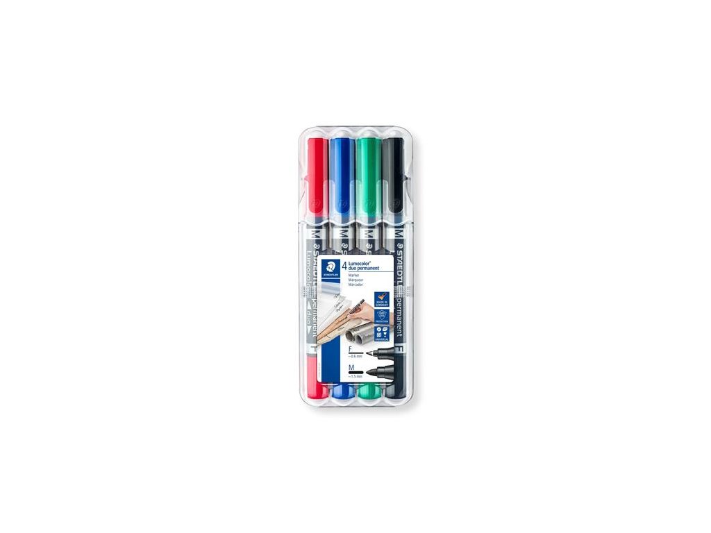 Permanentný popisovač, sada, F/M, 0,6/1,5 mm, kužeľový hrot, s 2 hrotmi, STAEDTLER "Lumocolor Duo", 4 rôzne farby
