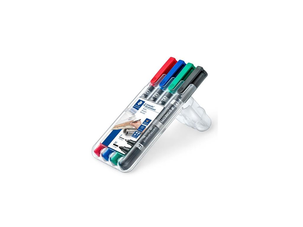 obojstranný popisovač takmer na všetky povrchy vodeodolný rýchloschnúci atrament intenzívne farby v patentovanom boxe STAEDTLER PP telo a uzáver pre dlhú životnosť "Dry Safe": bez uzáveru nevyschne niekoľko dní vhodný do lietadla atrament bez xylulou a toluolu vymeniteľná náplň Značka: STAEDTLER Výrobca: STAEDTLER SE Adresa: Moosäckerstr. 3 , 90427 Nuremberg, Germany Web: http://www.staedtler.com Email: https://www.staedtler.com/intl/en/service/contact/Dodatočné parametre